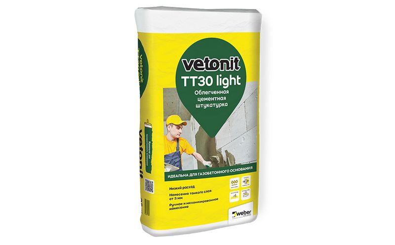 Штукатурка цементная облегченная vetonit TT30 light. Подходит для выравнивания любых типов оснований, включая газобетон. Низкий расход. Толщина нанесения от 3 мм до 30 мм, локально до 50 мм.